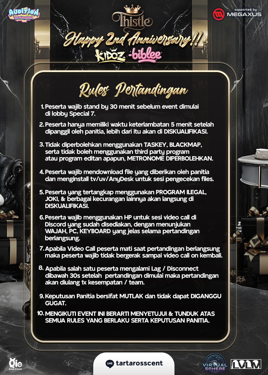 • PASTIKAN ID & NICK SESUAI KARENA DILARANG MELAKUKAN PERGANTIAN ID ATAU NICK.• Keputusan panitia bersifat mutlak.