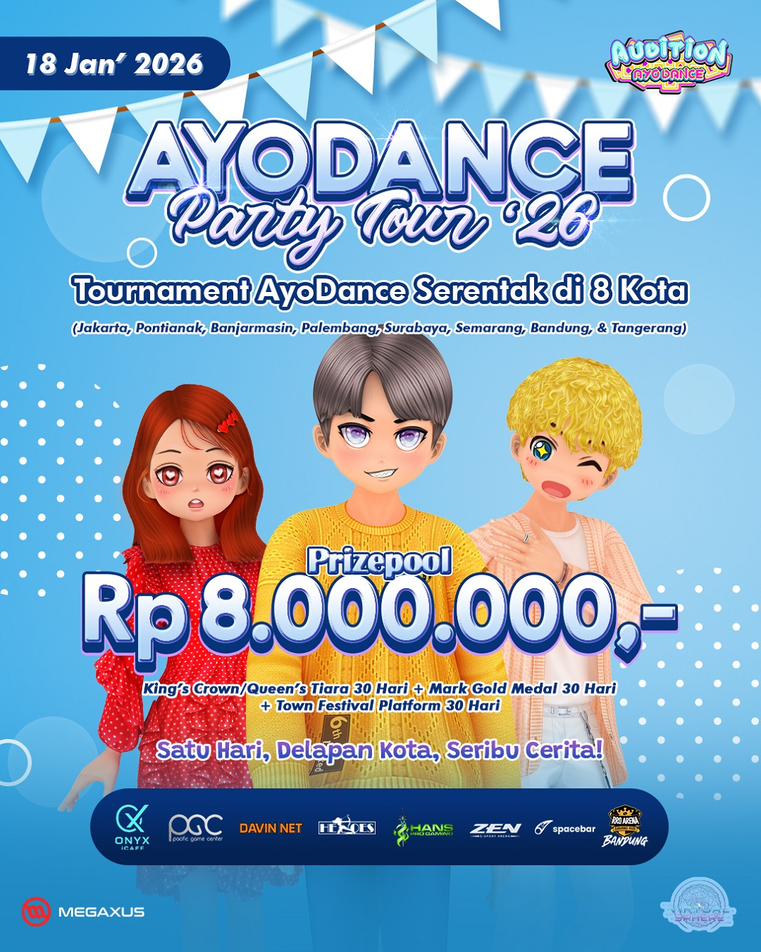 Hi Semuanya! AyoDance Party Tour bareng Virtual Sphere IDN bakal pecah kembali di 2026! Masih di 8 kota sekaligus dalam 1 hari! 😱